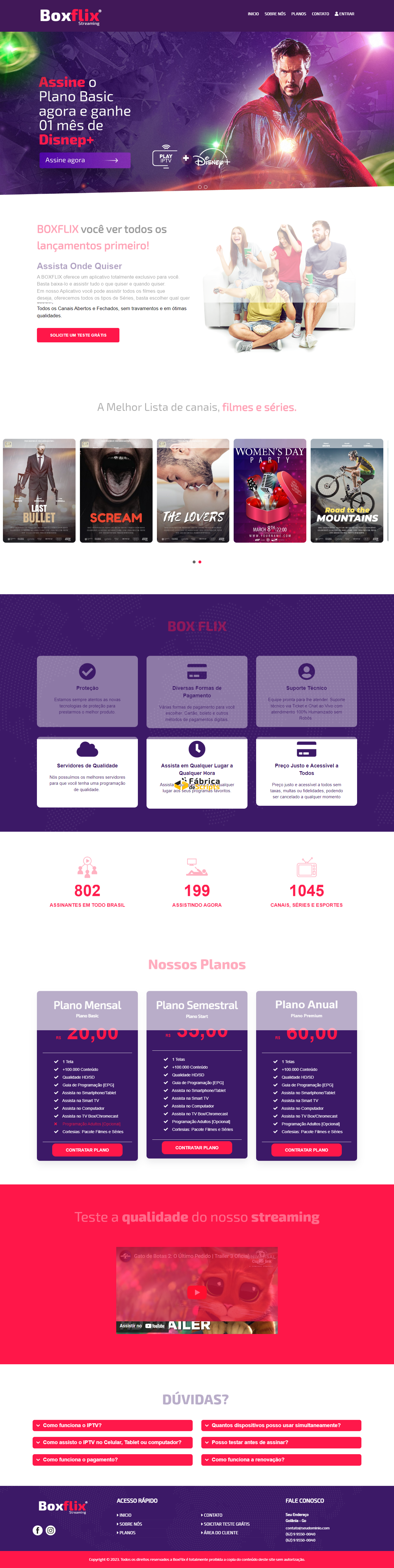 Site para Venda de IPTV Streaming de Vídeo 100% responsivo em PHP MySQL com Painel Administrador, fácil edição pelo painel, feito em PHP 5.6 a 7.0 MySQL, utilizando os Framework Bootstrap v3.3.7 e Font Awesome 5.7.0 para agiliza maior performance de navegação.